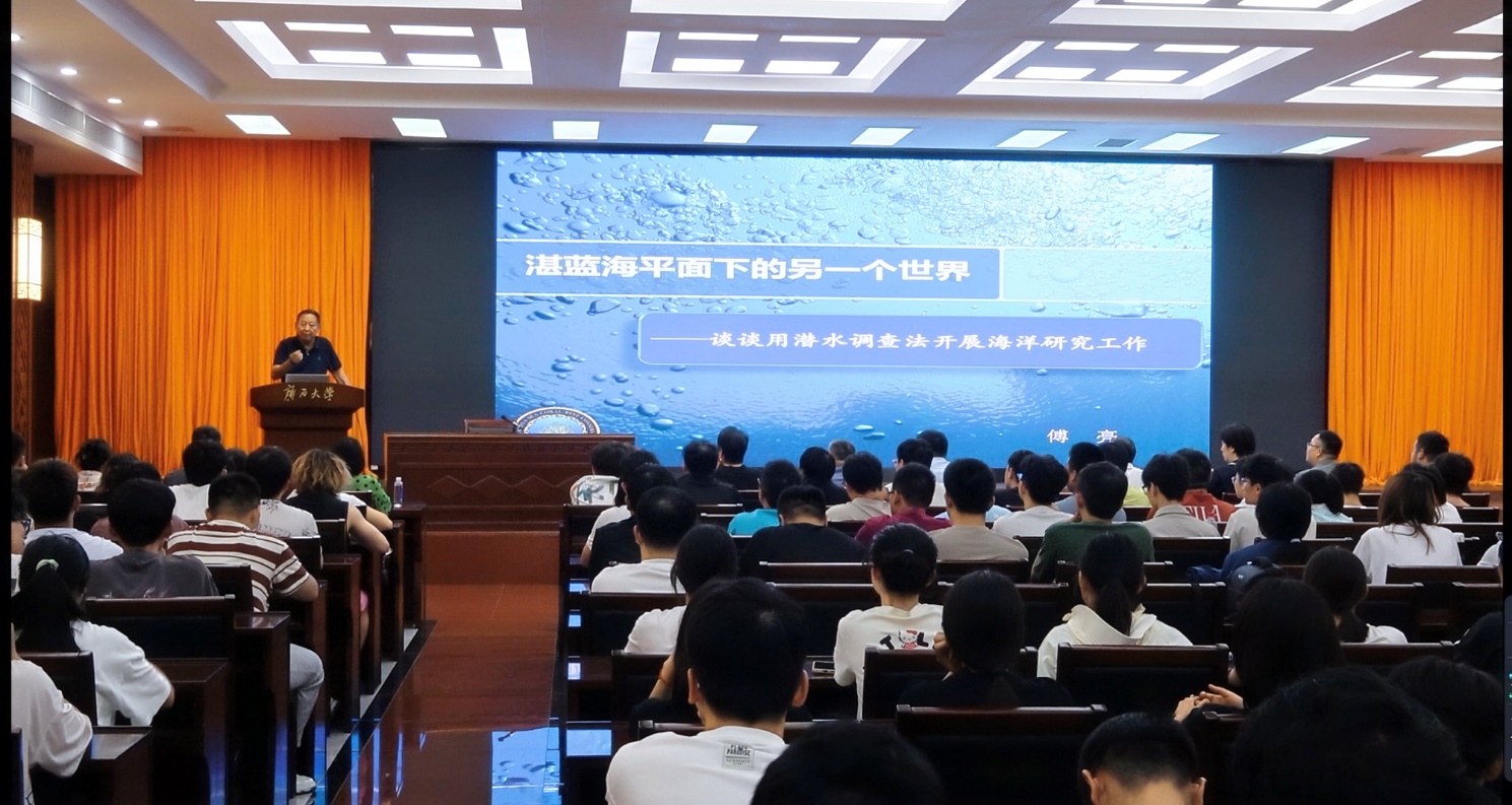 2025年9月17日晚,三沙航迹珊瑚礁保护研究所所长傅亮研究员受院长余克服教授邀请,以《湛蓝海平面下的另一个世界——谈谈用潜水调查法开展海洋研究工作》为题,为学院全体师生带来了一场兼具专业性与趣味性的科普报告。