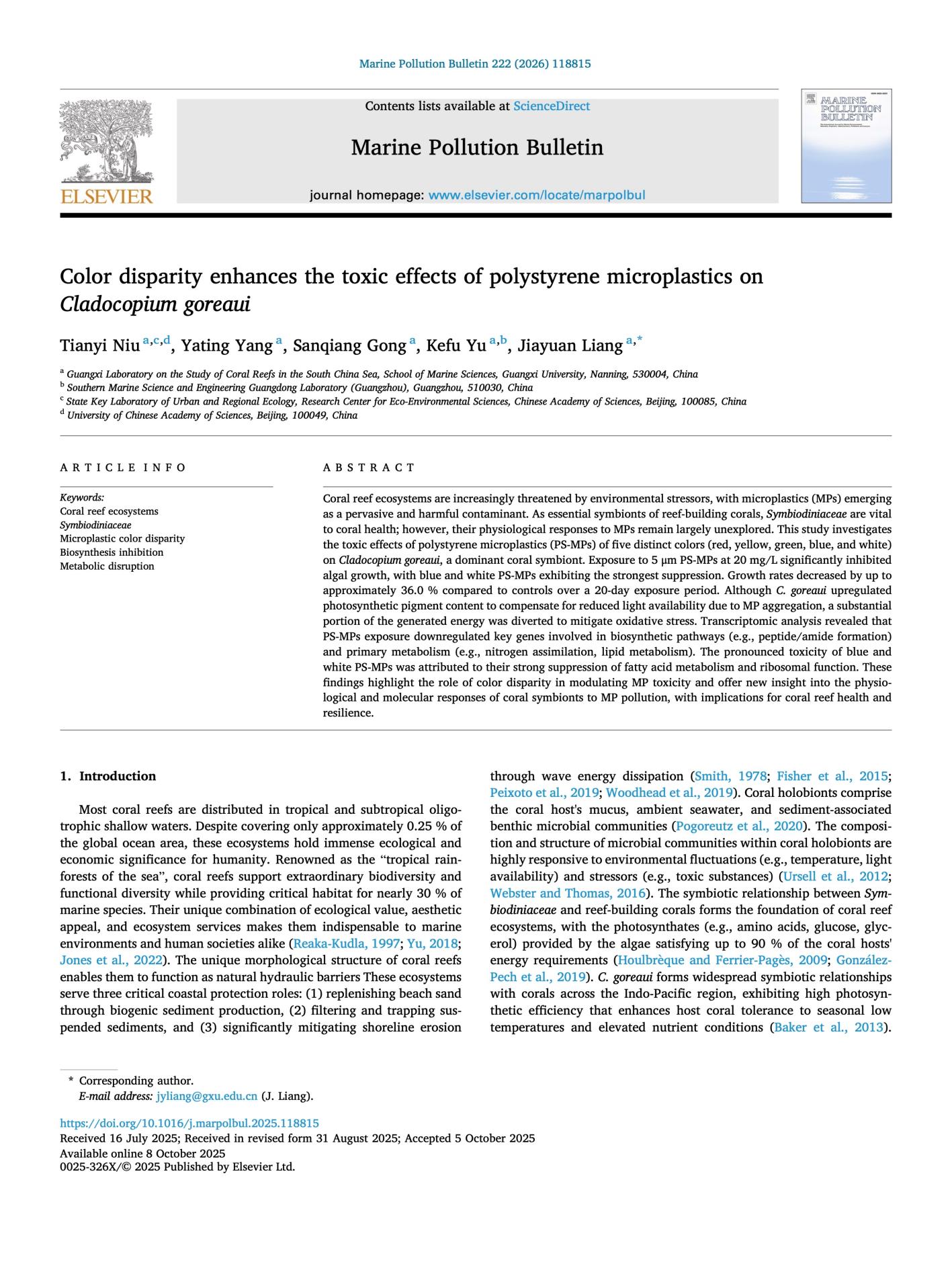 Tianyi Niu, Yating Yang, Sanqiang Gong, Kefu Yu, Jiayuan Liang*. Color disparity enhances the toxic effects of polystyrene microplastics on Cladocopium goreaui. Marine Pollution Bulletin, 222 (Part 2) : 118815. https://doi.org/10.1016/j.marpolbul.2025.118815