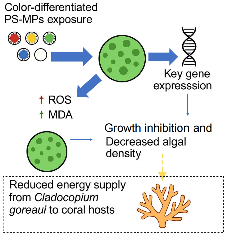 该研究首次系统阐明微塑料颜色差异在调控其对珊瑚共生虫黄藻毒性效应中的作用,从生理响应与基因表达层面揭示了不同颜色微塑料的生态风险差异,为评估微塑料污染对珊瑚礁生态系统的潜在影响提供了新的科学依据。