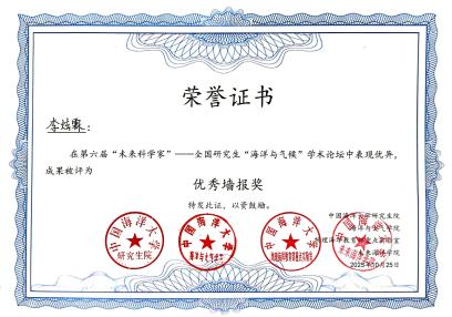 同时,我院另一位2024级硕士研究生李炫霖也凭借出色的研究成果,获得“优秀墙报奖”。他的墙报报告题目为《南海珊瑚共附生微生物对极端海洋热浪事件的响应模式》。